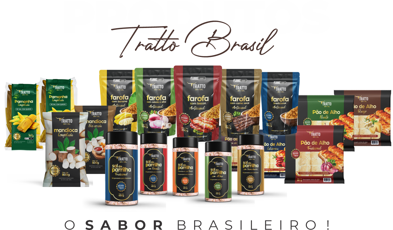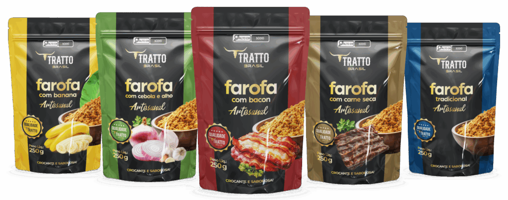As Farofas Tratto Brasil são produzidas artesanalmente a partir da farinha de mandioca, sendo ideal para qualquer tipo de combinação. Muito crocante, podendo ser saboreada no seu churrasco ou em suas refeições diárias. A Tratto Brasil conta com os seguintes sabores: Banana, Cebola e Alho, Bacon, Carne Seca e Tradicional.