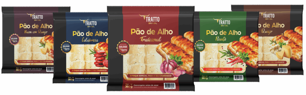 Deliciosamente recheados os Pães de Alho Tratto Brasil fazem sucesso nos churrascos da família e dos amigos. A Tratto Brasil conta com 5 variedades de sabores: Bacon com Queijo, Calabresa, Tradicional, Picante e Queijo.